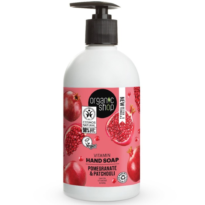 Organic Shop Hand Soap Pomegranate & Patchouli är en flytande tvål med växtbaserade ämnen som rengör händerna skonsamt. Tvålen innehåller granatäppleextrakt och patchouliolja, och har närande egenskaper för att göra huden smidig och inte verka uttorkande.