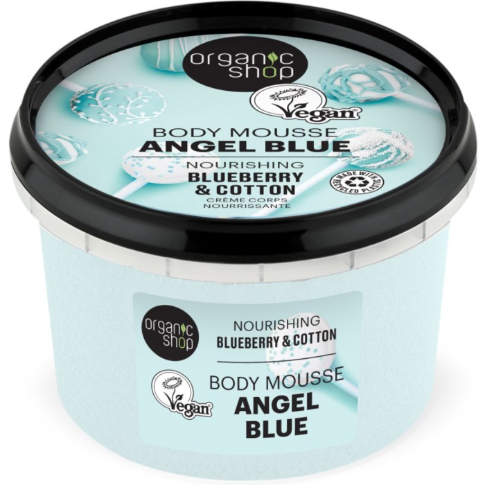 Organic Shop Body Mousse Angel Blue Blueberry är en väldoftande kroppsmousse berikad med ekologiskt blåbärsextrakt och bomullsblomextrakt. Ger huden näring och gör huden mjuk med fin lyster.