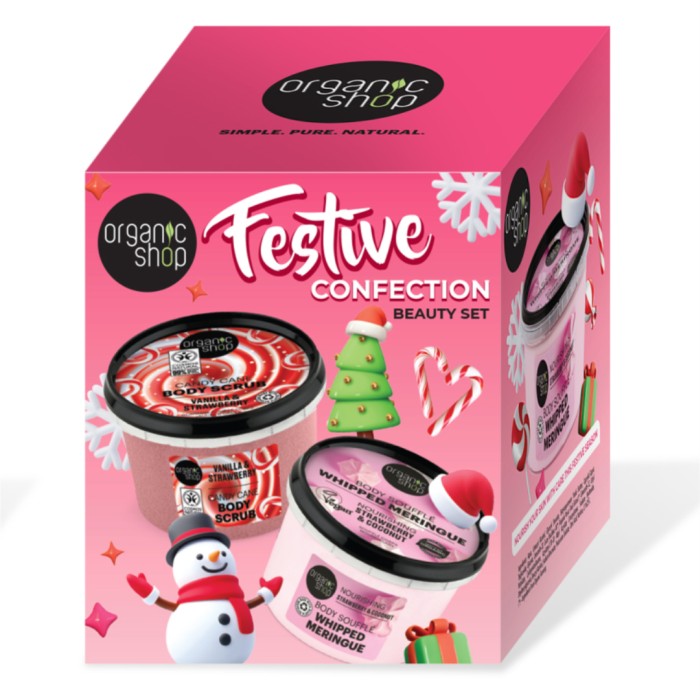 Organic Shop Festive Confection är en presentbox med en kroppspeeling och en hudkräm: Candy Cane Body Scrub 250 och Whipped Maringue Body Souffle 250 ml. Skrubben innehåller ekologiska vanilj- och jordgubbsextrakt och återfuktar huden under exfoliering, och lämnar en söt doft.