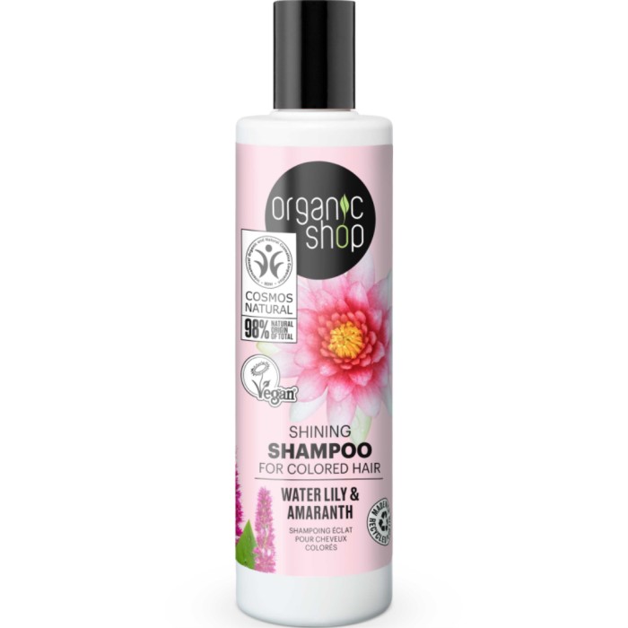 Shampoo Water Lily & Amaranth från Organic Shop är ett hårschampo med amarantolja och näckrosextrakt för färgat hår. Schampot är framtaget för att göra håret glansigt och hjälpa färgat hår att behålla färgen längre.