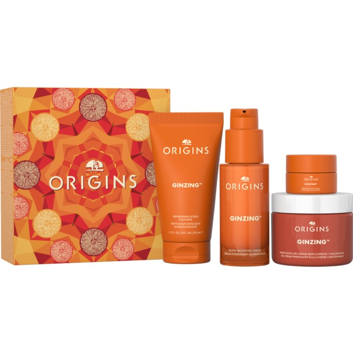 Origins Ginzing Glowing Essentials Gift Set är ett hudvårdsset med fyra Origins-produkter för en hud med lyster. Kitet innehåller favoriter ur serien GinZing™ - från rengöring till fuktkräm, inklusive två ordinarie storlekar.