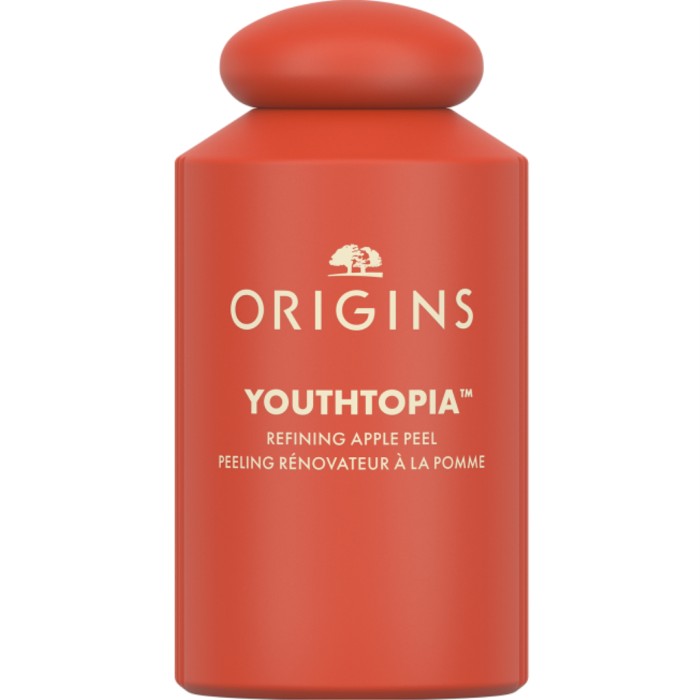 Origins Youthtopia ansiktspeeling använder Origins äppelcidervinäger- och glykolsyrakomplex för att släta ut huden, göra porerna mindre synliga och ge huden lyster. Den uppstramande återfuktningen gör att huden ser smidig ut, medan det antioxidantrika äppelskalsfermentet och stamcellsextraktet från äpple gör att huden ser yngre ut längre.