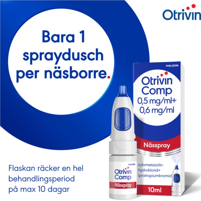 - Otrivin Comp är en snabb (inom 5 minuter) och långtidsverkande (upp till 8 timmar) nässpray