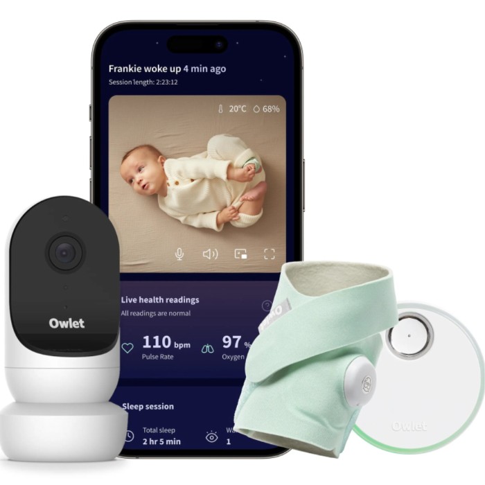 Owlet Dream Sock mäter barnets puls och syrenivåer i realtid, och skickar aviseringar direkt till din mobil vid avvikelser. Cam 2 låter dig se och höra ditt barn i 1080p HD via wifi, med funktioner som nattseende, tvåvägskommunikation och miljöövervakning. (Detta behöver kanske inte sägas, men mobiltelefonen på bilden ingår inte.)