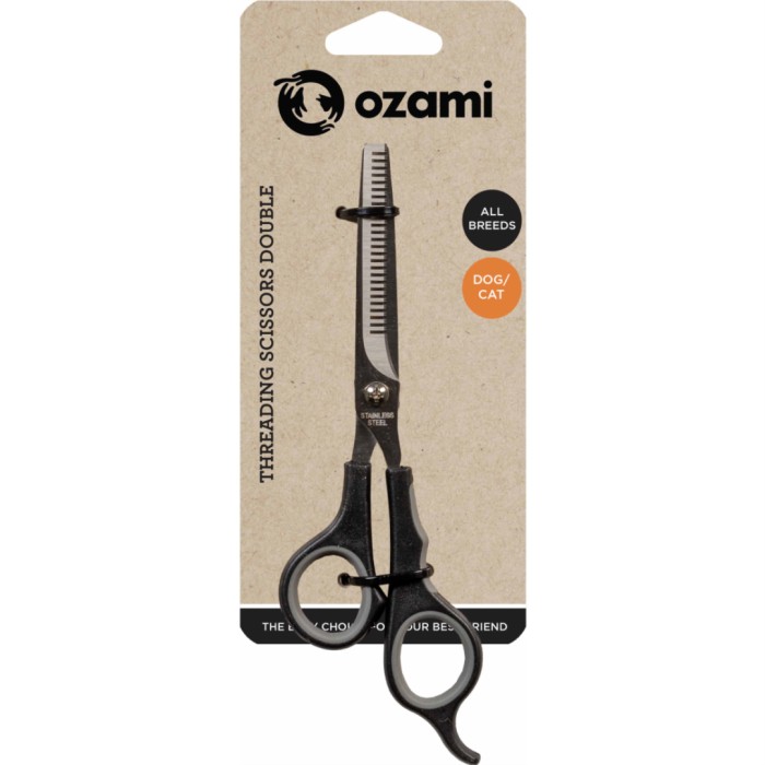 Ozami Threading Scissors Double 17,8 cm är en effektiv och smidig sax för enkel och säker trimning av både hundar och katter. Perfekt för att tunna ut pälsen och skapa en jämn och fin look. Tillverkad i rostfritt stål för lång hållbarhet. Ergonomiskt utformade handtag ger ett bekvämt grepp, vilket gör dem lätta att använda även under längre perioder. Passar alla pälstyper.