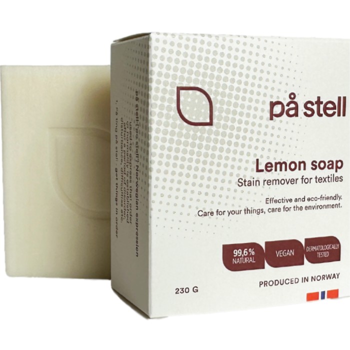 På Stell Citrontvål är en fläckborttagare som är både effektiv och naturlig. Citrontvålen från norska märket På Stell är en fläckborttagare som du ska kunna lita på, och den är tillverkad med helt naturliga ingredienser. Ekologisk, vegansk och biologiskt nedbrytbar. På Stell Citrontvål innehåller naturliga oljor från citron, raps, solros och kokos. Mild mot huden och dermatologiskt testad.