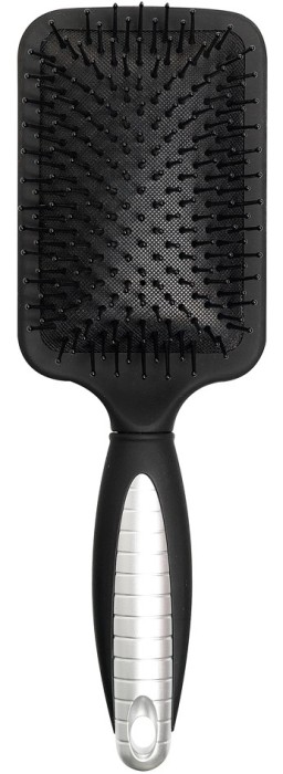 Avalea Paddelborste passar alla hårtyper och reder ut både vått och torrt hår. Borsten har tunna och flexibla pinnarna för att vara skonsam för håret och undvika onödigt slitage. En gummibelagd plastborste med avrundade nylonpiggar. Färg: Mattsvart/silver.