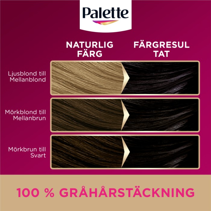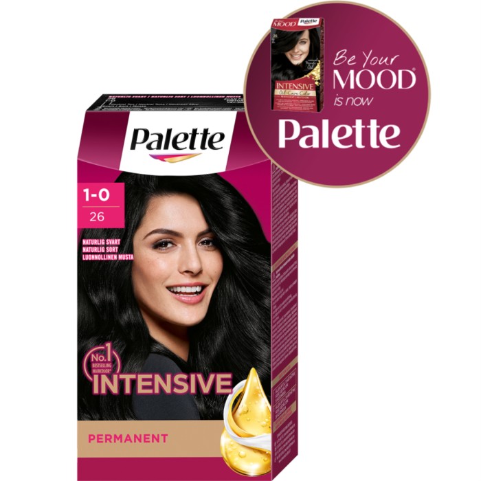 MOOD Palette är nu Palette! Palette Intensive Creme Coloration 1-0 Naturlig Svart permanent hårfärg med 100 % gråhårstäckning. Intensive Creme Coloration är en rik oljeberikad formulering med högkoncentrerade pigment som tränger in i håret för 100 % gråhårstäckning och långvarig färglyster fram till nästa färgning. Med en specialutvecklad fuktbevarande behandling som återfuktar håret på djupet och ger en silkeslen känsla. Den silikonfria formuleringen gör håret mjukare, mer lättkammat och ger glans. Ingredienserna i denna Palette hårfärg är upp till 93 % av naturligt ursprung*.