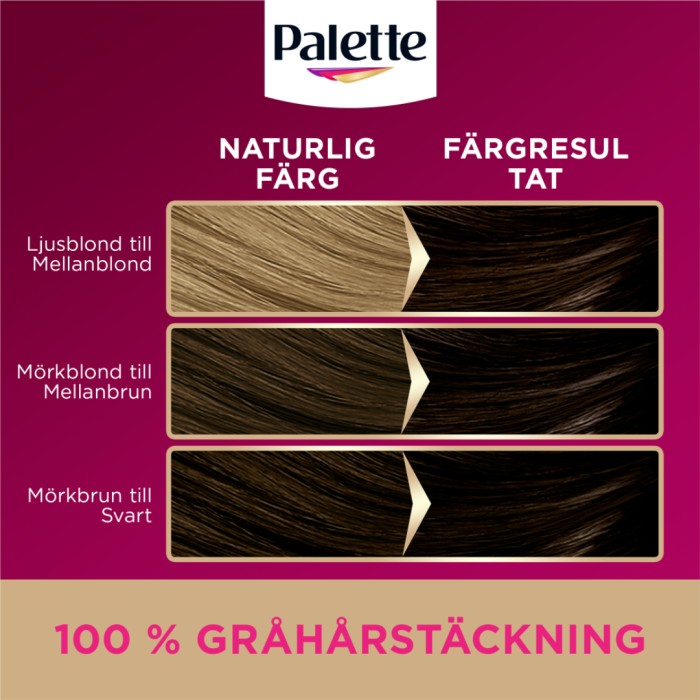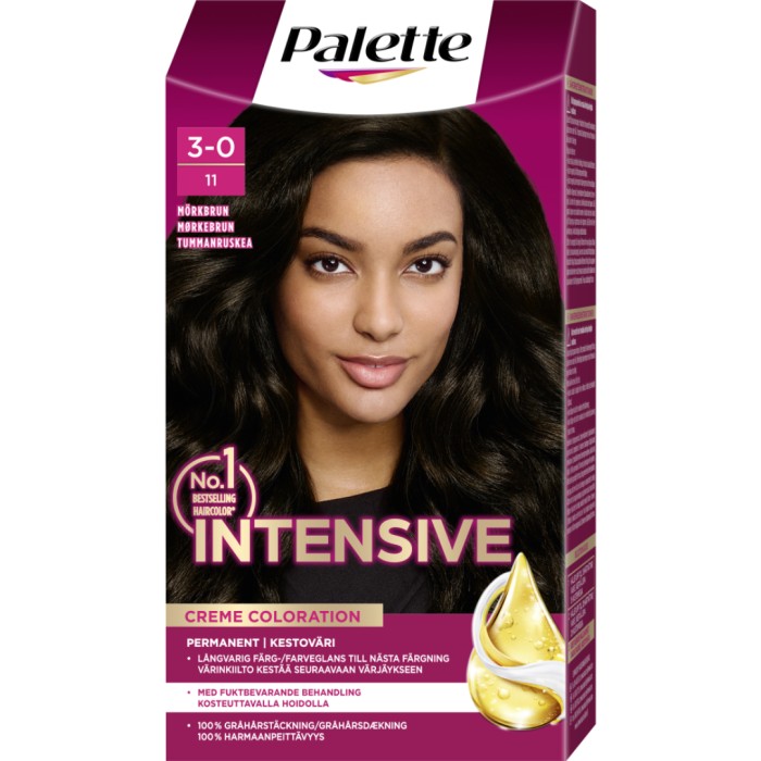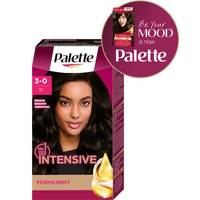 MOOD Palette är nu Palette! Palette Intensive Creme Coloration 3-0 Mörkbrun permanent hårfärg med 100 % gråhårstäckning. Intensive Creme Coloration har en rik oljeberikad formulering med högkoncentrerade pigment som tränger in i håret för 100 % gråhårstäckning och ger långvarig färglyster fram till nästa färgning. Med en specialutvecklad fuktbevarande behandling som återfuktar håret på djupet och ger en silkeslen känsla. Den silikonfria formuleringen gör håret mjukare, mer lättkammat och ger glans. Ingredienserna i denna Palette-hårfärg är upp till 93 % av naturligt ursprung*.