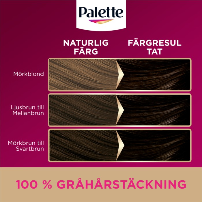 Palette Intensive Creme Coloration 4-0 Mellanbrun permanent hårfärg med 100 % gråhårstäckning. Intensive Creme Coloration har en rik och oljeberikad formulering med högkoncentrerade pigment som tränger in i håret för 100 % gråhårstäckning och ger långvarig färglyster fram till nästa färgning. Med en specialutvecklad fuktbevarande behandling som återfuktar håret på djupet och ger en silkeslen känsla. Den silikonfria formuleringen gör håret mjukare, mer lättkammat och ger glans. Ingredienserna i denna Palette-hårfärg är upp till 93 % av naturligt ursprung*. Kartongen är FSC-certifierad. Aluminiumtub och bruksanvisning kan återvinnas. Innehåller 50 ml Color Creme /50 ml utvecklingsemulsion/15 ml Care Conditioner