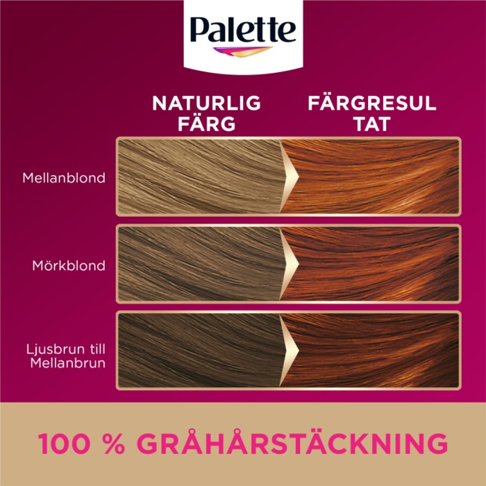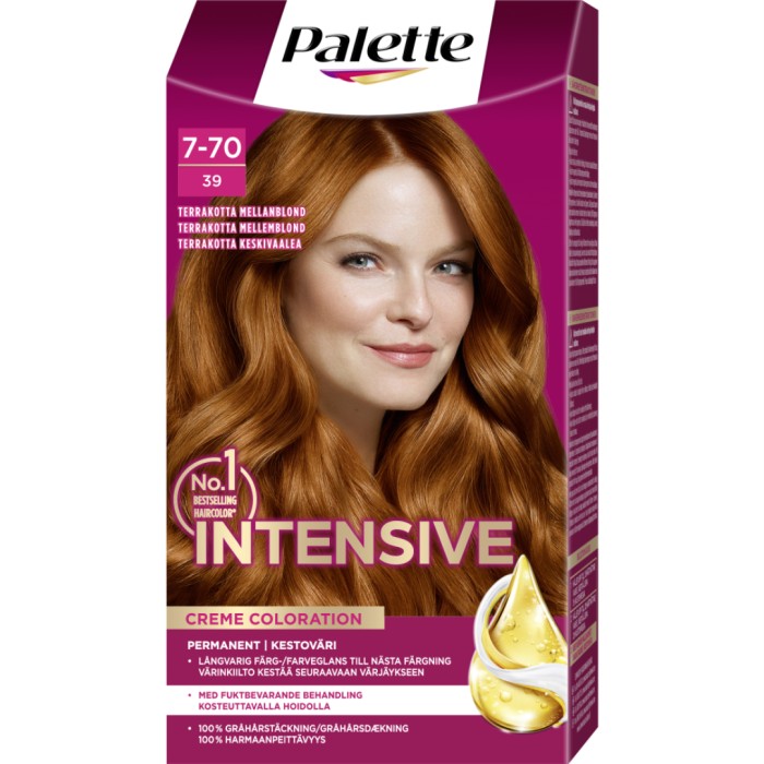 Palette Intensive Creme Coloration 7-70 Terrakotta Mellanblond permanent hårfärg med 100 % gråhårstäckning. Den fylliga olje-i-kräm-formuleringen tränger in i håret med högkoncentrerade pigment för 100 % gråhårstäckning och ger långvarig färglyster fram till nästa färgning. Med en specialutvecklad fuktbevarande behandling som återfuktar håret på djupet och ger en silkeslen känsla. Den silikonfria formuleringen gör håret mjukare, mer lättkammat och ger oemotståndlig glans. Ingredienserna i denna Palette hårfärg är upp till 93 % av naturligt ursprung*.