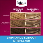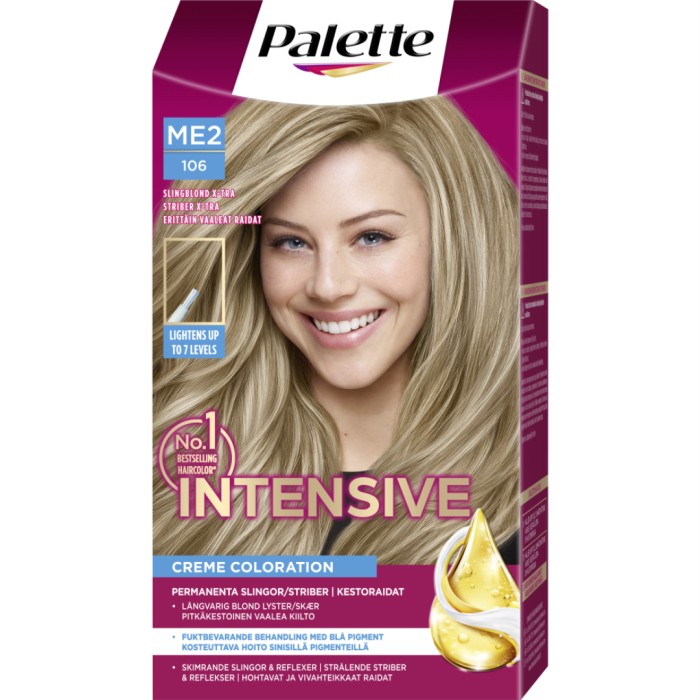 Palette Intensive Creme Coloration ME2 Slingblond X-tra permanenta slingor för blond lyster som bleker upp till 7 nivåer. Denna fylliga slingblondering tillför uppljusande ämnen i håret för blond lyster och bleker upp till 7 nivåer och ger mångfacetterade permanenta slingor och reflexer. Efter slingbehandling hjälper Palette-efterbehandlingen med blåa pigment att neutralisera gula toner. Håret blir mer lättkammat och känns både djupt återfuktat och silkeslent.