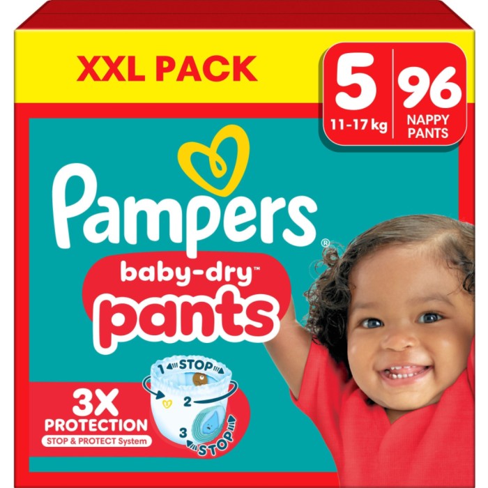 Pampers Baby-Dry Byxblöjor Stop & Protect System har: 2x bredare* benmuddar som hjälper till att förhindra läckage runt benen, en ficka baktill som hjälper till att stoppa läckage, 360° flexibel midja som formar sig efter barnets kropp när det rör sig och en superabsorberande kärna som ger upp till 12 timmars skydd.