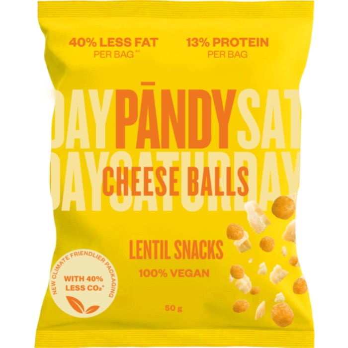 Pändy Lentil Snacks Cheese Balls är krispiga linsbollar med smak av ost. Linsbollarna innehåller mindre fett än många traditionella snacks, och mer protein. Veganska.