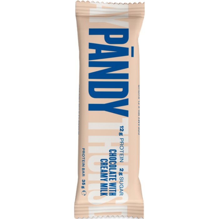 Pändy Protein Bar Chocolate with Creamy Milk är en proteinbar där man satt smaken i fokus. Varje Pändy-bar innehåller en hög andel protein och låg andel socker: en bar innehåller 12 gram protein och 1 gram socker. Pändy proteinbar kan tas som ett litet mellanmål eller före/efter träningen och innehåller 130 kcal per bar. Innehåller sötningsmedel.