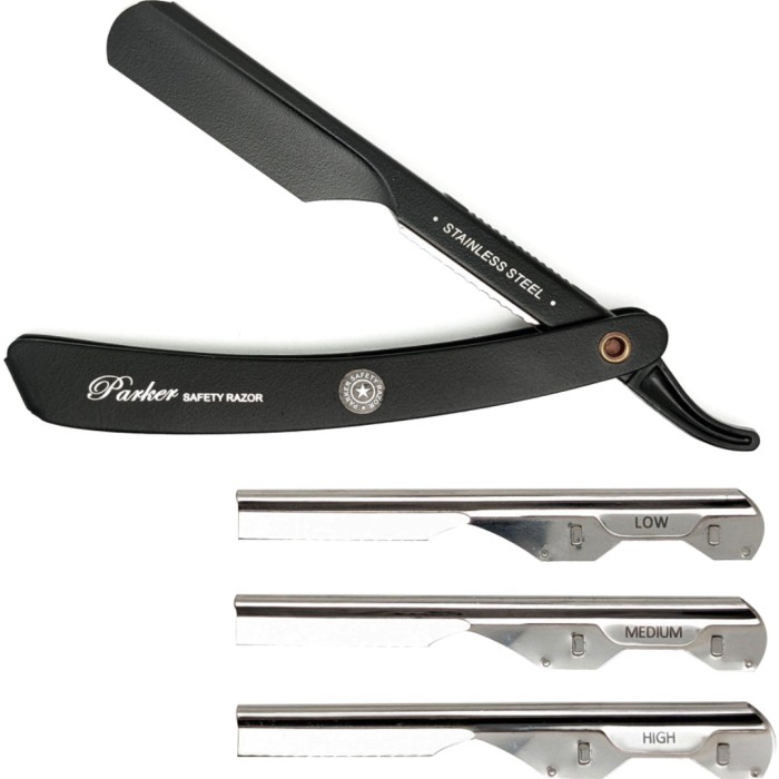 Parker Shaving PTABK Adjustable Push with 3 Blade Option Metal Black Barber/Straight Razor är en justerbar rakkniv i rostfritt stål med tre insatser – var och en med olika exponering för blad så att du kan anpassa din rakning. Du kan välja ett skär med låg, medel eller hög exponering för bladen, beroende på uppgift, kompetensnivå, hudtyp eller skäggväxt. Det är som att ha tre olika rakhyvlar i en.