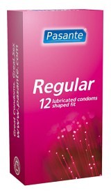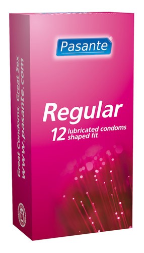 Regular har anatomisk form för bättre passform och är glidmedelsbehandlad med vattenbaserat glidmedel. Kondomen har behållare och är av standardstorlek.