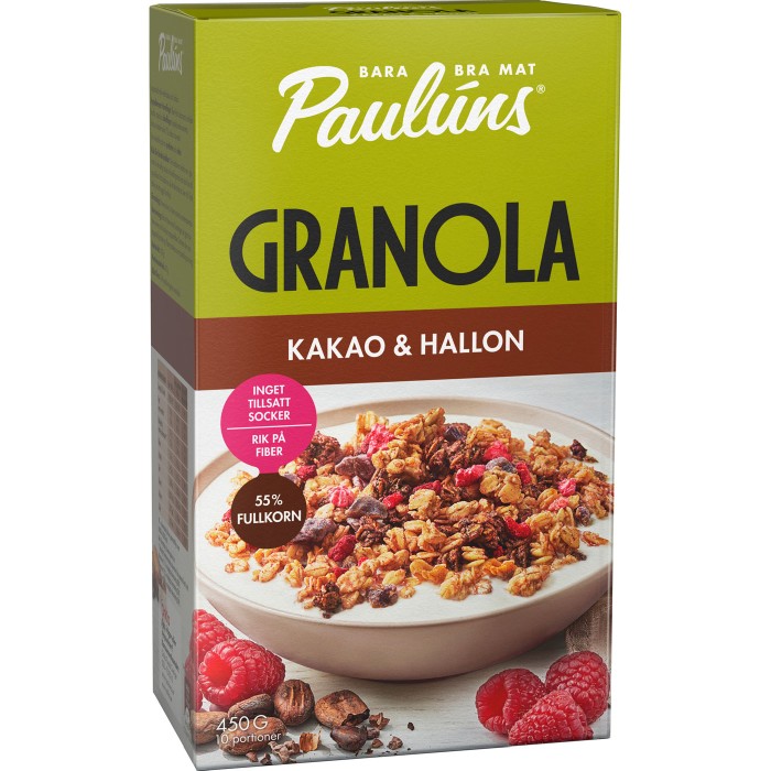 Paulúns Granola Kakao & Hallon är en knaprig müsli som bakats i ugn. Müslin har bakats med lite vegetabilisk olja, äppeljuicekoncentrat och oligofruktos (ett vegetabiliskt fiber) för att bli riktigt crunchy. Granolan innehåller kakao, torkade hallonbitar och naturligt söta dadlar.