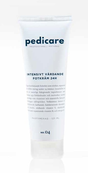 Pedicare Intensivt Vårdande Fotkräm 24H återfuktar huden på djupet, en fotkräm som stärker, reparerar och tillför näring under 24 timmar.
