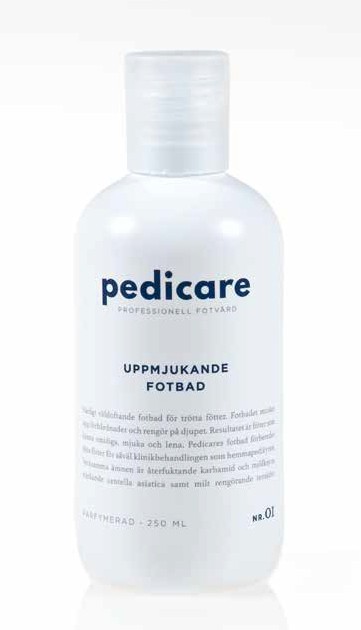 Pedicare Uppmjukande Fotbad är ett väldoftande bad för trötta fötter. Fotbadet mjukar upp förhårdnader och gör fötterna rena. Pedicares fotbad innehåller aterfuktande ingredienser såsom karbamid och mjölksyra och milt rengörande tensider. Gör att dina fötter känns smidiga och mjuka.