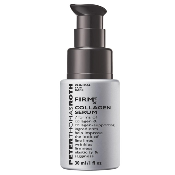 Firmx Collagen Serum från Peter Thomas Roth är ett antiage-ansiktsserum med sju typer av kollagen och kollagenstimulerande ingredienser. Serumet är framtaget för att bidra till att huden upplevs som fastare och smidigare. Serumet innehåller marint kollagen, växtkollagen och hydrolyserat kollagen för att bidra till att fina linjer och rynkor upplevs som mindre framträdande, och förbättra känslan av fasthet och elasticitet. Ingredienser som hydroxyproline, peptider, kollagenaminosyror och fettsyror hjälper till att förstärka effekten av kollagenet.