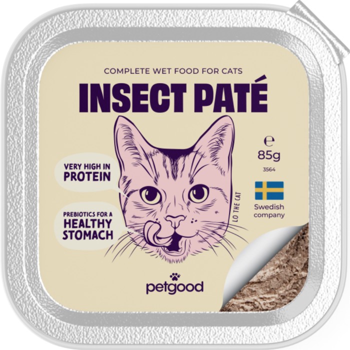 Petgood insektspaté är ett komplett och balanserat våtfoder för vuxna katter. Petgoods insektsbaserade våtfoder kombinerar en bra smak med ett högt innehåll av näringsrikt insektsprotein och fettsyror som ger energi och främjar pälsens hälsa. Kan användas som enda foder eller i kombination med torrfoder.