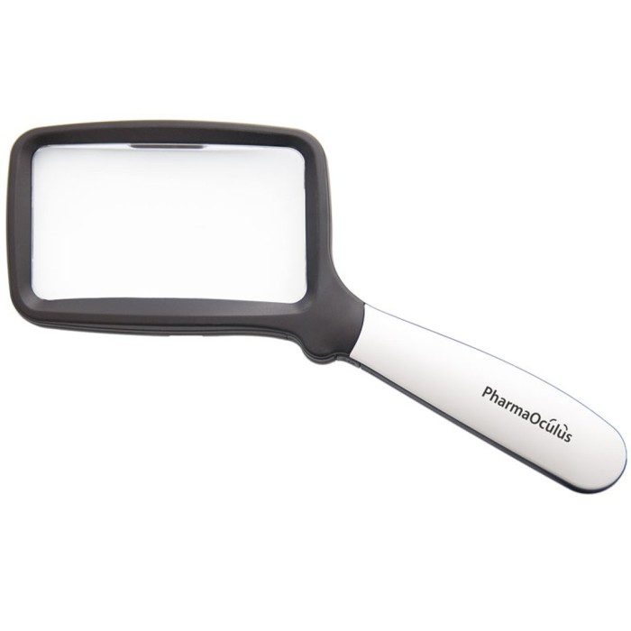 PharmaOculus har en stor lins, 108 x 63 mm, anpassad för läsning av mindre text. Det rektangulära formatet ger jämt fokus över en större yta än ett runt förstoringsglas. De fem högeffektiva och justerbara LED-lamporna ger god belysning över hela ytan. Praktiskt och ergonomiskt hopfällbart handtag.
