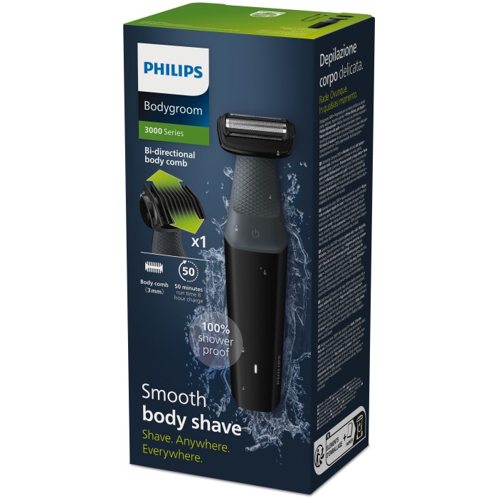 Bodygroom 3000 är en hudvänlig rakapparat med countour-följande 2D-teknik. Rakhuvudet har patenterade rundade spetsar och en folie som skyddar huden från skärsår vid rakning. En dubbelriktad trimmer och kam för att trimma i alla riktningar. Kroppstrimmern är helt vattentät, och kan användas både i och utanför duschen, och är enkel att rengöra. För allra bästa resultat, använd på torrt hår innan du duschar. Fulladdad ger den 50 minuters trådlös användning.