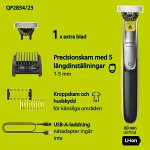 Med Philips OneBlade 360 kan du trimma, forma och raka alla hårlängder på ett enkelt sätt, även på svåråtkomliga ställen som på halsen, med färre drag ((jämfört med OneBlade QP210). Du behöver inte använda flera steg eller verktyg. Denna modell av OneBlade har det innovativa 360-rakbladet som är flexibelt för att bibehålla öka hudkontakt och säkerställa kontroll. OneBlade följer ansiktets konturer så att du enkelt och bekvämt kan trimma och raka alla områden. Använd det dubbelsidiga bladet för att styla kanterna och skapa rena linjer genom att röra bladet i valfri riktning.