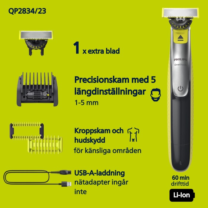 Philips OneBlade har en revolutionerande teknologi som är specialdesignad för ansiktsgrooming, och kan raka alla hårlängder. Det dubbla skyddssystemet med glidbeläggning i kombination med rundade kanter gör rakningen både enkel och bekväm. Raktekniken bygger på en snabbrörlig skärenhet (12 000 rörelser per minut) som är mycket effektiv, även på längre hår. Bladet har konstant hudkontakt genom att det rör sig i alla riktningar.
