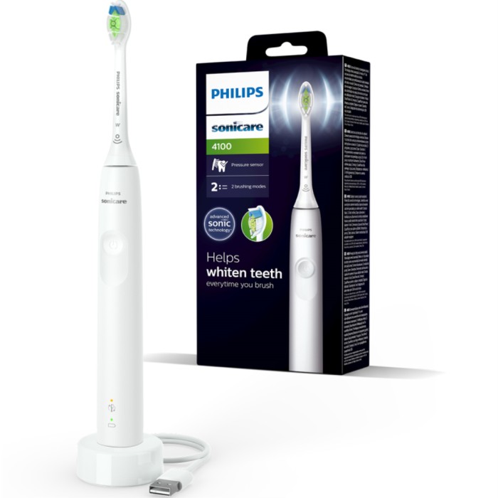 Philips Sonicare 4100 eltandborste är designad för en bra plackborttagning och vitare tänder. Avlägsnar upp till tre gånger mer plack jämfört med en manuell tandborste. Ger en högeffektiv tandborstning med avancerad Sonicare-teknik, och har två rengöringslägen (Clean & Sensitive) och inbyggd trycksensor. Upp till 14 dagars batteritid på en enda laddning och W2 Optimal White-borsthuvud för en god munhälsa.