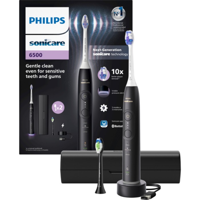 Philips Sonicare 6500 är nästa generations laddningsbara soniska tandborste, designad för en skonsam men effektiv borstning som tar bort upp till 10 gånger mer plack* och ger 5 gånger friskare tandkött. Eltandborsten är utrustad med unik Sonicare-teknik skapar mikrobubblor som underlättar rengöringen mellan tänderna. Det ovala borsthuvudet rengör flera tänder åt gången. Det gör att du kan borsta på samma sätt som med en manuell tandborste, bara bättre och med mindre ansträngning. Passar för känsliga tänder och känsligt tandkött. Kombinationerna gör att du kan välja mellan 9 inställningar: 3 lägen (Clean, Sensitive eller White) och 3 intensiteter (Low (sensitive), Medium, High).