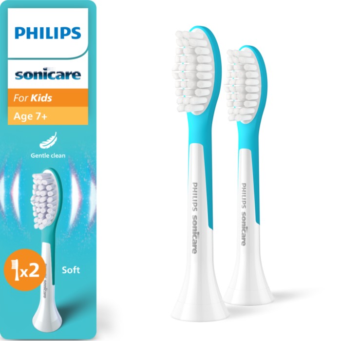 Med Philips Sonicare for Kids borsthuvuden för eltandborstar för barn från 7 år får barnets tänder en skonsam och effektiv rengöring. Borsthuvudet är specialutformat för skonsam rengöring av små munnar. Borsthuvudet har mjuka borststrån för skonsam rengöring, en anpassad borstprofil för att passa ditt barns tänder och en mjuk gummiyta på baksidan för ökad komfort i munnen.