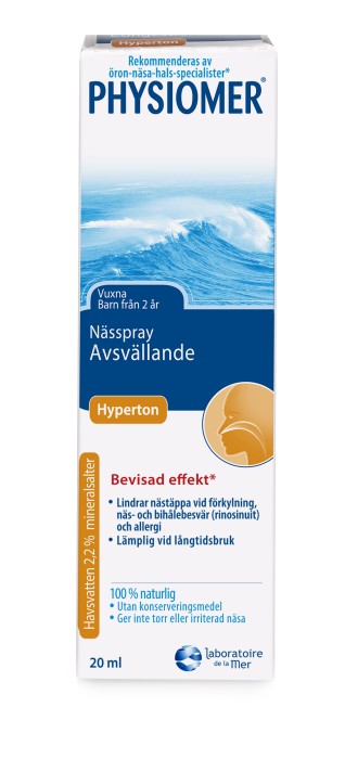 Physiomer Hyperton Spray rekommenderas av öron-näsa-halsspecialister och kan användas dagligen eller vid behov eftersom den inte skadar nässlemhinnan vid långtidsanvändning. Den kan även användas av gravida och ammande samt personer med högt blodtryck, hjärt- eller sköldkörtelsjukdom.