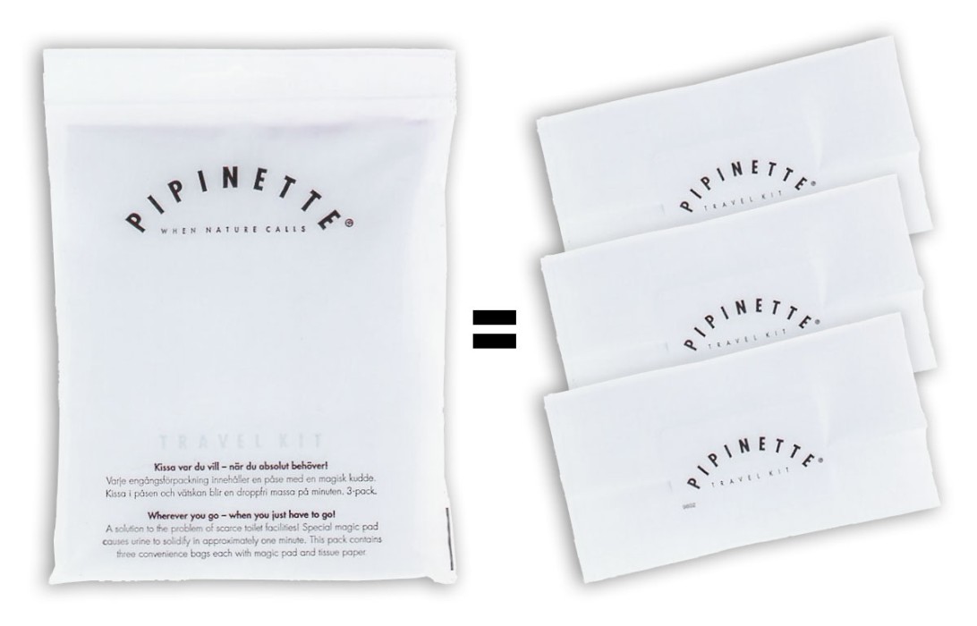 Pipinette travelkit inlägg är en vit, ogenomskinlig plastpåse med en dyna med superaborberande pulver. Absorberar exempelvis urin och omvandlar det till en gel / fast massa som lätt kan förvaras tills den kastas i hushållsoporna eller i komposten.