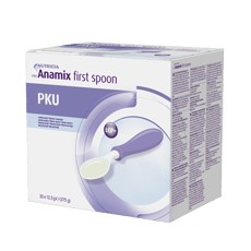 PKU Anamix First Spoon är en aminosyrabaserad spädbarnsnäring i pulverform med mycket lågt innehåll av fenylalanin. Avsedd för kostbehandling av barn med fenylketonuri (PKU) från 6 månaders ålder upp till 5 år. Innehåller essentiella och icke-essentiella aminosyror, kolhydrat, vitaminer och mineraler. Dessutom supplementerad med DHA (dokosahexaensyra) och ARA (arakidonsyra). PKU Anamix First Spoon måste kompletteras med annan mat för att täcka barnets behov av fenylalanin och övriga näringsämnen. Tillredd enligt anvisning ger pulvret en puré lämplig att äta med sked.