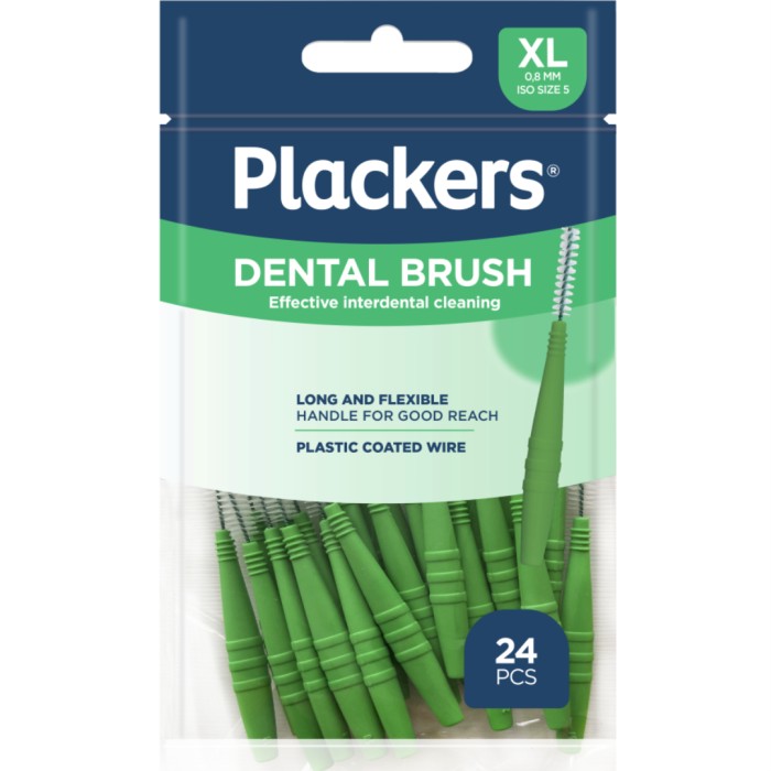 Plackers Dental Brush är en mellanrumsborste med ett smidigt handtag som ger bra grepp. Kan böjas en aning för att ge en effektiv rengöring mellan tänderna. Mellanrumsborstarna har plastöverdragen metalltråd för att vara skonsamma att använda.