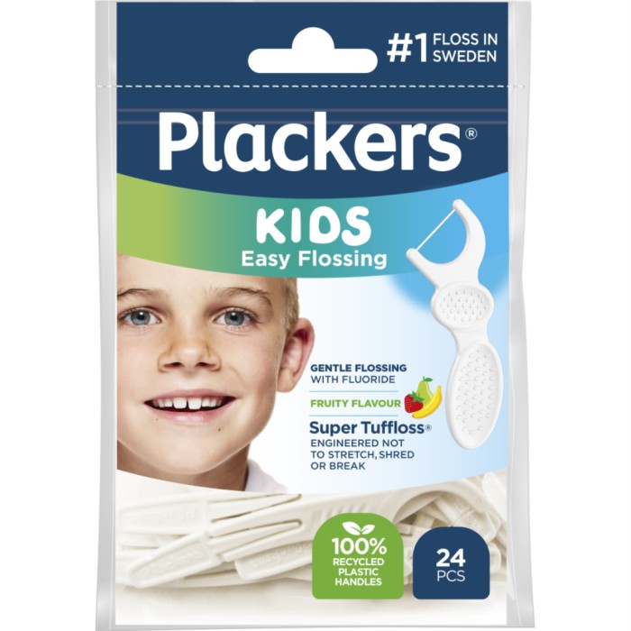 Plackers® Kids Easy Flossing är tandtrådsbyglar med Tuffloss®- tråd med fruktsmak, speciellt anpassad för barn 7-12 år. Super Tuffloss®-tråden rengör effektivt plack och matrester mellan tänderna. Tandtråden innehåller fluor och tråden är speciellt utformad för att inte gå sönder, och är så pass stark att den kan användas mer än en gång. Tråden glider lätt mellan tänderna och ger en effektiv rengöring.