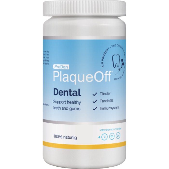 ProDen PlaqueOff® Dental är ett 100% naturligt kosttillskott framställt av algen A.N ProDen®, för minskning av plack och tandsten. Den växer under arktiska förhållanden och skördas utanför Norges kust. Algen torkas och mals till ett pulver som fylls i kapslar. Produkten är avsedd att vara ett komplement till din vardagliga tandborstning.