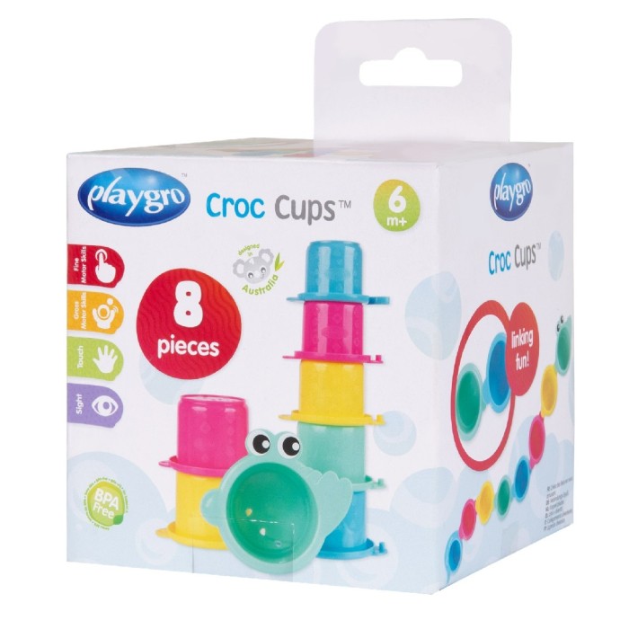 Playgro Crocodile Cups är klossar för barnet att stapla eller sätta ihop. Stapla klossarna, eller sätt ihop dem till ett långt tåg. Roliga att använda i badet då det finns små hål i botten av klossarna. För barn från 6 månader.