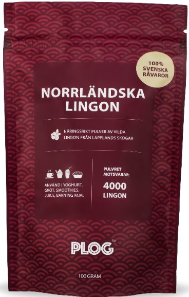 PLOG Norrländska Lingon är ett pulver gjort på 100% lingon från Sverige, inget annat. Lingonen i Plogs pulver har vuxit vilt i skogar i Lappland, där de blivit extra rika på näring under de långa dagarna i norr när det nästan inte blir mörkt. Lingon innehåller C-vitamin, tanniner och antioxidanten resveratrol.