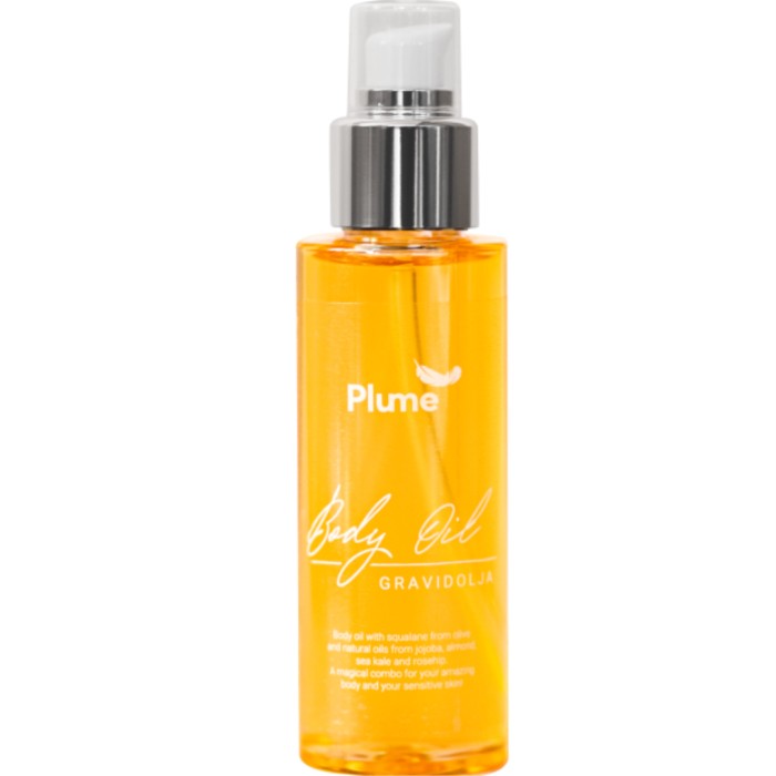 Plume Gravidolja är en parfymfri hudolja som kan användas till hela kroppen, även ansiktet, och till din bebis. Oljan är framtagen för att användas på en kliande mage under graviditet, för att mjuka upp bristningar samt för massage av mellangården. Plume Gravidolja är väldigt dryg och går snabbt in i huden.