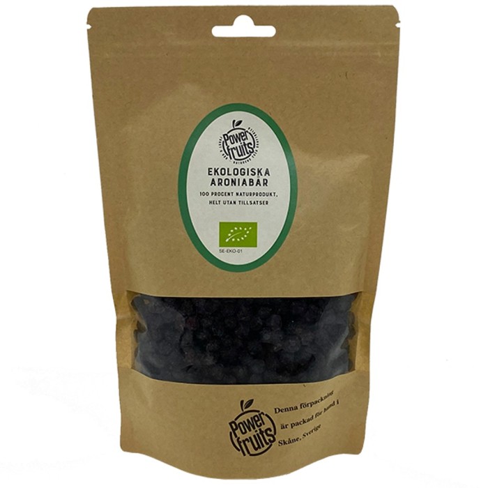Ekologiska torkade Aroniabär från Powerfruits. Aroniabären (Aroniamelanocarpa) kallas även för svart Aronia. Aroniabusken kommerursprungligen från Nordamerika men har länge odlats i Östeuropa.
