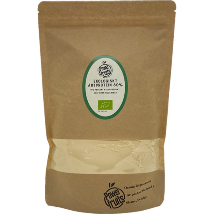 Powerfruits Ärtprotein 80% är ett växtbaserat protein. Ärtprotein kan intas efter träning för att hjälpa kroppen att återhämta sig och fylla på med protein. Ärtprotein är vegetabiliskt protein som utvinns ur ekologiska ärtor. Ärtor ingår i släktet baljväxter. Pulvret kan användas i smoothies, havregrynsgröt eller i matlagning.