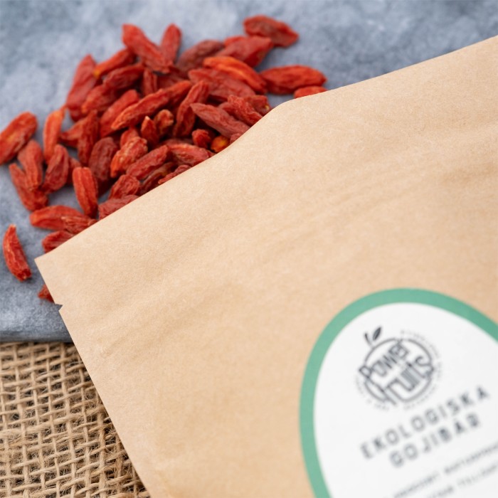 Ekologiska gojibär från Powerfruits. Gojibäret kan vara gott att blanda med olika typer av nötter och äta som en snack, eller ha i frukostmüsli eller i en smoothie.