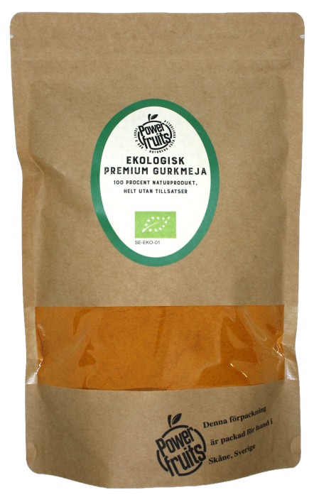 Powerfruits Gurkmeja Premium är ett ekologiskt och raw gurkmejapulver. Gurkmejan består till fem procent av färgpigmentet curcumin.