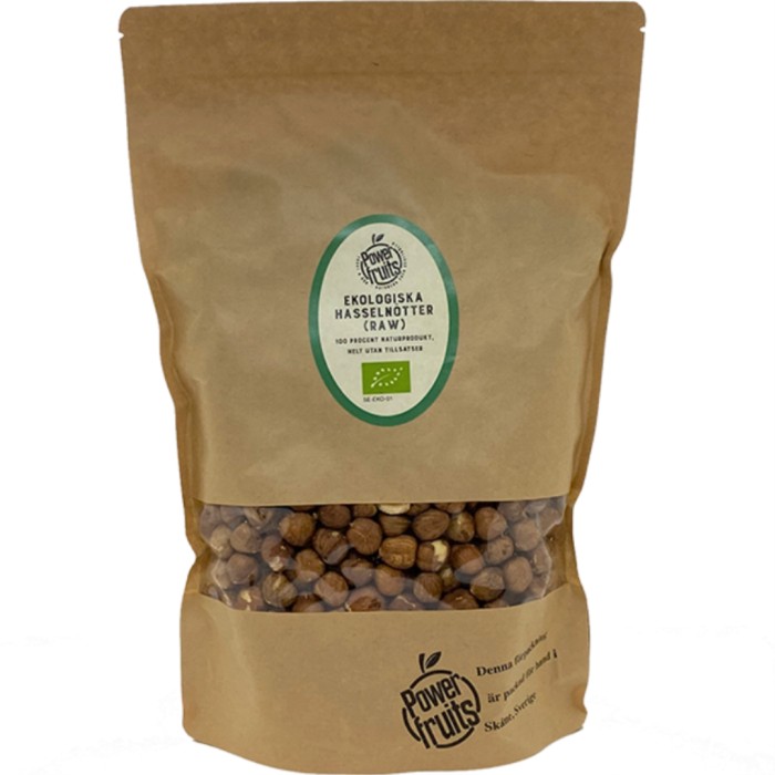 Ekologiska och raw hasselnötter från Powerfruits. Nötterna innehåller antioxidanter, magnesium, järn, vitaminer och nyttiga fetter. Kan ätas direkt ur påsen som en snack, eller hackas upp och användas i bakning, desserter eller i müslin.