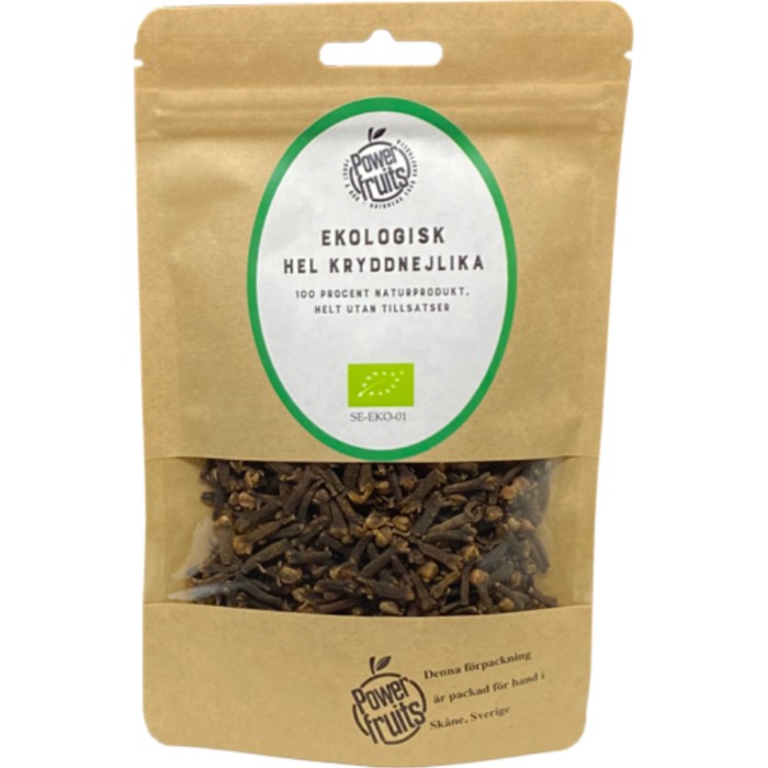 Powerfruits Hela kryddnejlika är ekologisk kryddnejlika med en intensiv aromatisk smak. Används ofta under juletid i bland annat pepparkakor och glögg.
