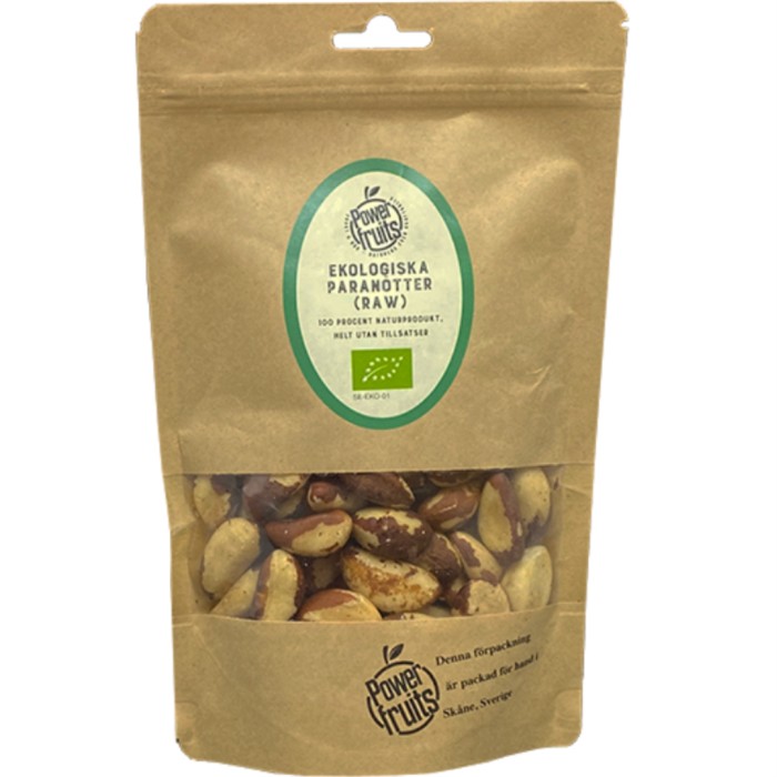 Ekologiska paranötter från Powerfruits innehåller protein, fleromättade fetter och selen. De goda nötterna kan ätas som ett mellanmål direkt ur påsen, eller hackas och användas i bakning, i desserter, på yoghurten, i sallader eller till matlagningen. Nötterna har en krispig, söt och nötig smak.