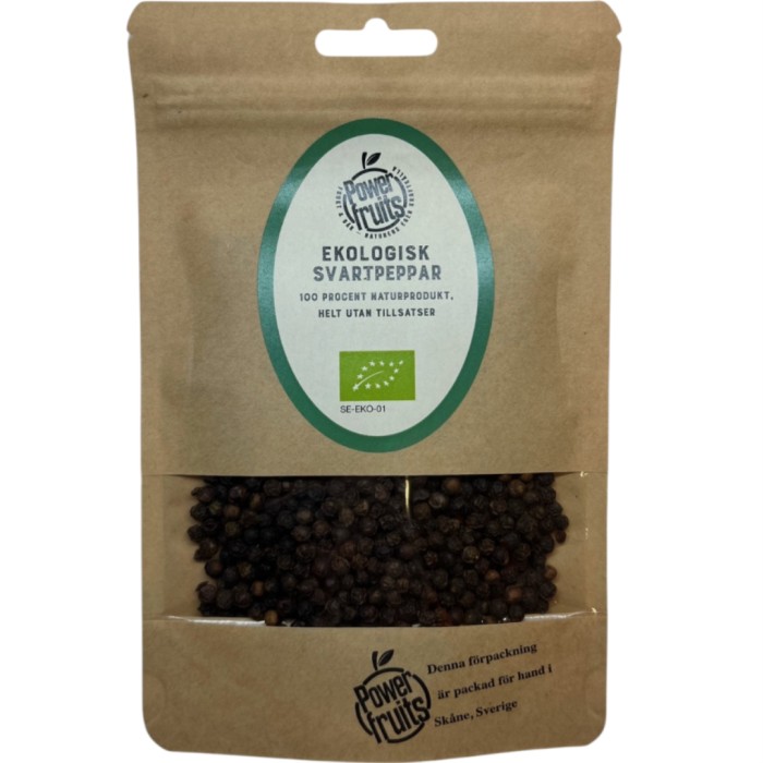 Powerfruits Hel svartpeppar är ekologisk svartpeppar, en av de mest använda kryddorna i världen. Den framställs av de halvmogna bären på pepparplantan som samlas ihop i högar och läggs ut i solen för att jäsa och torka. Svartpeppar kan användas i all matlagning.